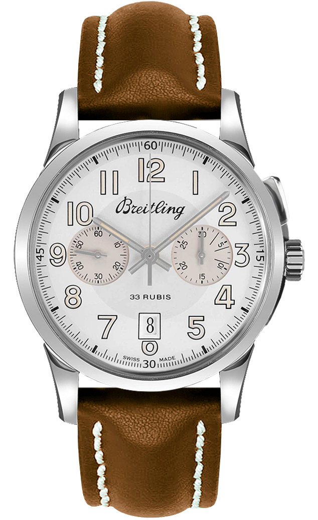 Breitling Transocean Chronograph 1915 AB141112/G799-433X men's watch. Limited Edition, Numbered out of 1915 ever made. Features a polished stainless steel case and brown leather strap. Polished stainless steel fixed bezel. Mercury silver dial with luminescent hands and Arabic numeral hour markers. 60 second / minute track. Date window displayed at 6 o'clock. Chronograph with large central chronograph seconds hand and 30 minute counter sub-dial at 3 o'clock. Small seconds sub-dial at 9 o'clock. Powered by the Breitling Caliber B14 manual winding COSC Chronometer certified movement which boasts a 70 hour power reserve, beats at 28,800 vph and contains 33 jewels. A scratch resistant glareproof sapphire crystal protects the dial. The case is round, 43mm in diameter, weighs 113.10g and is 14.60mm thick. Inlet size: 22mm. Sapphire crystal exhibition case back. Push and pull crown. Stainless steel tang buckle. Water resistant to 100 meters / 330 feet. Functions: hours, minutes, small seconds, date, chronograph. Casual watch style. Swiss made.