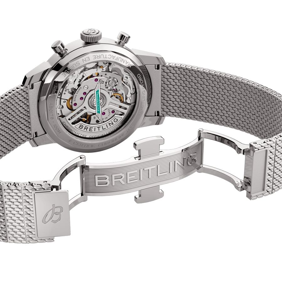 Experience timeless elegance and precision with the Breitling Top Time B01 Ford Thunderbird AB01766A1A1A1. This exquisite timepiece features a sleek silver dial adorned with index hour markers, perfect for keeping track of time with accuracy. The chronograph function allows you to measure elapsed time with ease, while the tachymeter scale adds a touch of sophistication to the 41mm stainless steel case. Paired with a steel mesh bracelet and folding clasp, this automatic chronometer is not just a watch, but a statement of style and craftsmanship. Elevate your wristwear collection with the Breitling Top Time B01 Ford Thunderbird AB01766A1A1A1.