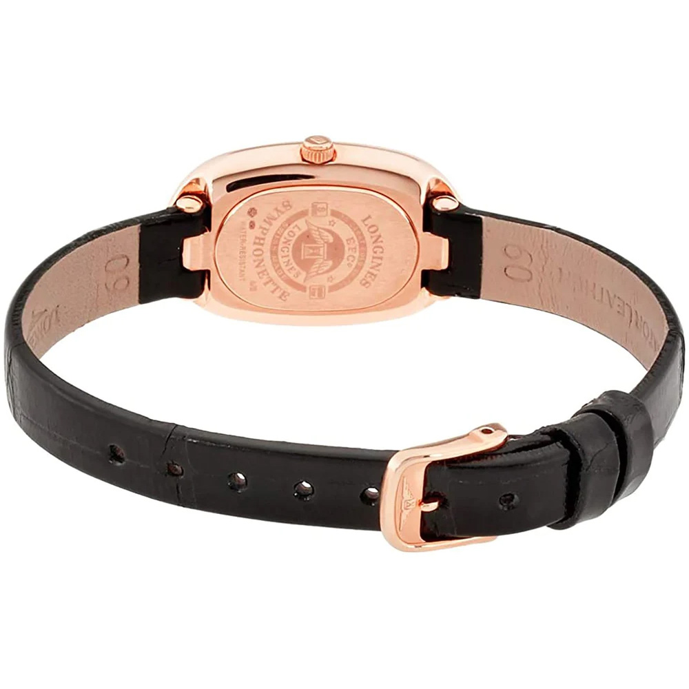 Experience elegance and sophistication with the Longines Symphonette L2.305.8.87.0. This exquisite timepiece showcases a stunning white mother of pearl dial, accentuated by sparkling diamond hour markers. The 19mm x 29.4mm solid 18k rose gold case adds a touch of luxury, while the black leather strap and rose gold tang buckle ensure a comfortable and secure fit. Powered by a precise quartz movement, this watch combines beauty and functionality seamlessly. Embrace timeless style with the Longines Symphonette L2.305.8.87.0, a perfect accessory for any occasion.