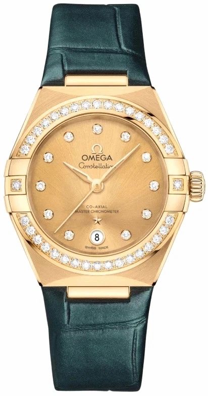 Experience timeless elegance with the Omega Constellation 131.58.29.20.58.001 timepiece. This stunning watch features a captivating Yellow dial adorned with sparkling diamond hour markers and a convenient date display. Encased in luxurious 18k yellow gold, the 29mm watch is complemented by a bezel set with diamonds The green leather strap Z016712 with a 18k tang buckle BBZ014572 adds a touch of sophistication to this automatic chronometer, while its anti-magnetic properties ensure precision timekeeping. Elevate your style with the Omega Constellation 131.58.29.20.58.001 watch, a true symbol of luxury and quality.