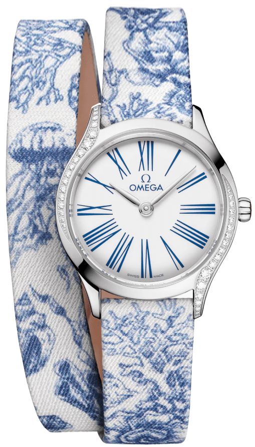 This women's fashion watch, the Omega De Ville Mini Tresor 428.17.26.60.04.001, boasts a polished stainless steel case and a blue & white fabric strap Z017321 with a stainless steel tang buckle Z017285. Its white dial features blue Roman numeral hour marker. The watch is powered by the Omega caliber 4061 battery operated quartz movement with a 'Long Life' feature to maximize battery autonomy. An inlet size of 13mm and a special mirrored case back with a 'Her Time' pattern add to the watch's unique features. Additionally, it has a push and pull crown set with a single diamond and red details on the crown.