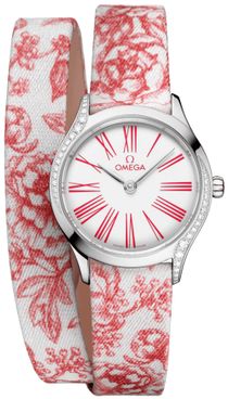 This women's fashion watch, the Omega De Ville Mini Tresor 428.17.26.60.04.003, boasts a polished stainless steel case and a red & white fabric strap Z017319 with a stainless steel tang buckle Z017285. Its white dial features red Roman numeral hour marker. The watch is powered by the Omega caliber 4061 battery operated quartz movement with a 'Long Life' feature to maximize battery autonomy. An inlet size of 13mm and a special mirrored case back with a 'Her Time' pattern add to the watch's unique features. Additionally, it has a push and pull crown set with a single diamond and red details on the crown.