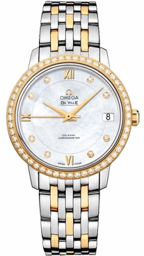 This Omega De Ville Prestige 424.25.33.20.55.001 is a beautiful timepiece that features a white mother of pearl dial and diamond and roman numeral hour markers, with a date window at 3 o'clock. Crafted with precision, the stainless steel case measures 32.7mm and is set with an 18k yellow gold bezel encrusted with diamonds for extra sparkle and shine. The two-tone bracelet has a sliding clasp for easy adjustment, while the automatic chronometer-certified movement ensures accurate timekeeping. This luxurious watch from Omega is sure to elevate any ensemble with its exquisite design and quality craftsmanship.