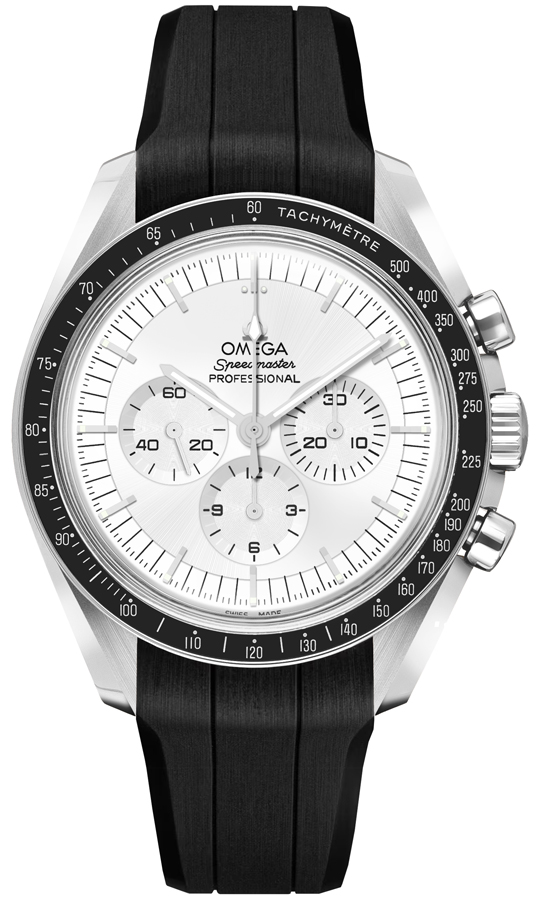 Omega Speedmaster Moonwatch Professional Men's Watch 310.63.42.50.02.001. This new luxury Speedmaster model from Omega features a solid 18k white 'Canopus' gold case and is fitted with a black rubber strap. A tachymeter scale is engraved on the black anodized aluminum bezel ring. The silver dial has index hour markers and a chronograph feature that includes a small seconds sub-dial at 9 o'clock. This watch is powered by the Omega Caliber 3861 Co-axial Master Chronometer manual winding COSC certified movement with a 50-hour power reserve.