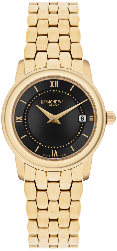 Raymond Weil Tradition 5398-P-00207 women's watch. Features a yellow gold-tone stainless steel case and bracelet. Yellow gold-tone stainless steel fixed bezel. Black dial with index and Roman numeral hour markers. Date window displayed at 3 o'clock. Powered by a battery operated quartz movement. A scratch resistant sapphire crystal protects the dial. The case is round and 27mm in diameter. Push and pull crown. Yellow gold-tone stainless steel butterfly clasp deployment buckle. Water resistant to 30 meters / 100 feet. Functions: hours. minutes, date. Casual watch style. Swiss made.