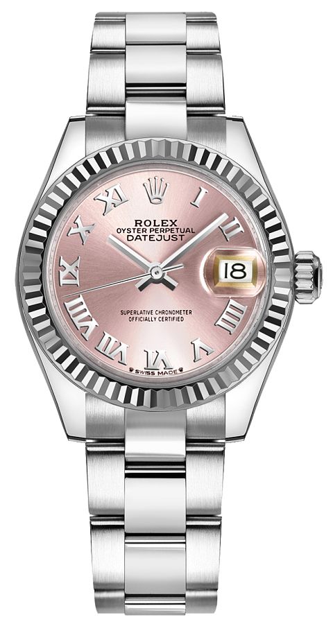 This stunning timepiece from Rolex is the perfect accessory for the modern woman. The Lady-Datejust 28 279174-0018 features a beautiful pink dial with Roman numeral hour markers, as well as a date window for keeping track of important dates. The stainless steel case sports an 18k white gold fluted bezel and is complemented by an oyster bracelet with a folding oysterclasp. Powered by an automatic chronometer-certified movement, this timepiece is sure to keep you punctual and stylish. With its luxurious design and quality craftsmanship, this Rolex Lady-Datejust 28 is sure to become a treasured addition to any wardrobe.