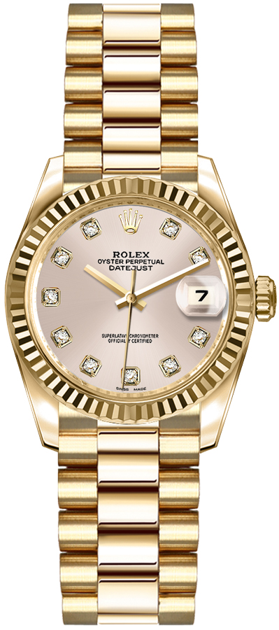 Rolex Lady-Datejust 26 179178 solid 18k yellow gold women's watch. Features a solid 18k yellow gold case and polished with brushed solid 18k yellow gold president bracelet. Polished solid 18k yellow gold fluted bezel. Pink dial with diamond markers. Date window displayed under cyclops lens at 3 o'clock with instantaneous date setting. Powered by the Rolex Caliber 2235 self-winding automatic COSC Superlative Chronometer certified movement which boasts a 48 hour power reserve, beats at 28,800 vph and contains 31 jewels. A scratch resistant sapphire crystal protects the dial. The case is round and 26mm in diameter. Screw down crown with Twinlock double waterproofness system. Screw down case back. Solid 18k yellow gold concealed folding crownclasp deployment buckle. Waterproof to 100 meters / 330 feet. Functions: hours, minute, seconds, date. Luxury watch style. Swiss made.