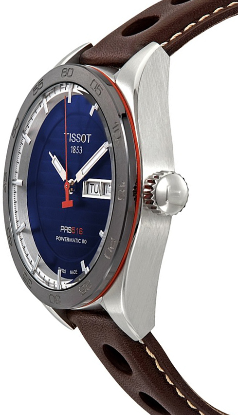 The Tissot PRS 516 Powermatic 80 is the most prestigious sports watch in Tissot's collection. This model features floating indices, adding a powerful 3D effect to the dial. This automatic movement with an 80-hour power reserve sport men's watch was inspired by racing cars. Stainless steel case with a brown leather strap. Blue dial with luminescent hands and index hour markers. Fixed black ceramic bezel. Domed scratch resistant sapphire crystal with double-sided antireflective coating. Transparent case back. Case size: 42mm. Case thickness: 12.9mm. Round case shape. Butterfly clasp with push buttons. Water resistant at 100 meters/330 feet. Functions: date, day, hour, minute, second. Sport watch style. Tissot PRS 516 Powermatic 80 T100.430.16.041.00.