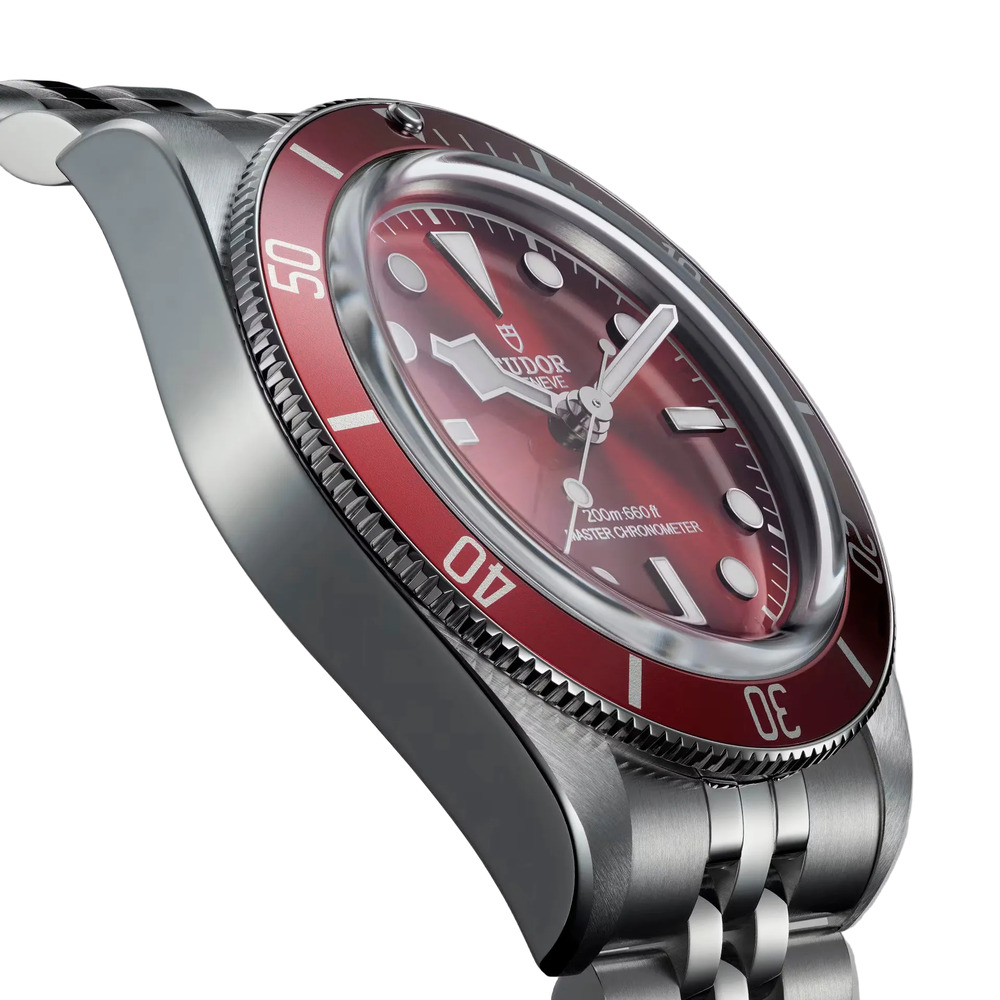The Tudor Black Bay 58 Burgundy is a striking men's automatic watch that blends vintage style with modern performance. It features a rich burgundy dial complemented by dot and index hour markers, framed by a stainless steel bezel with a matching anodised aluminium insert. Housed in a 39mm stainless steel case with polished and satin finishes, it is paired with a 5-link bracelet and a secure TUDOR “T-Fit” deployment clasp. Powered by the COSC-certified Tudor Caliber MT5400-U, this self-winding chronometer delivers an impressive 65-hour power reserve. A domed sapphire crystal protects the dial, while luminescent hands and markers enhance readability in low light. Water-resistant up to 200 meters, this timepiece is both refined and ready for adventure.