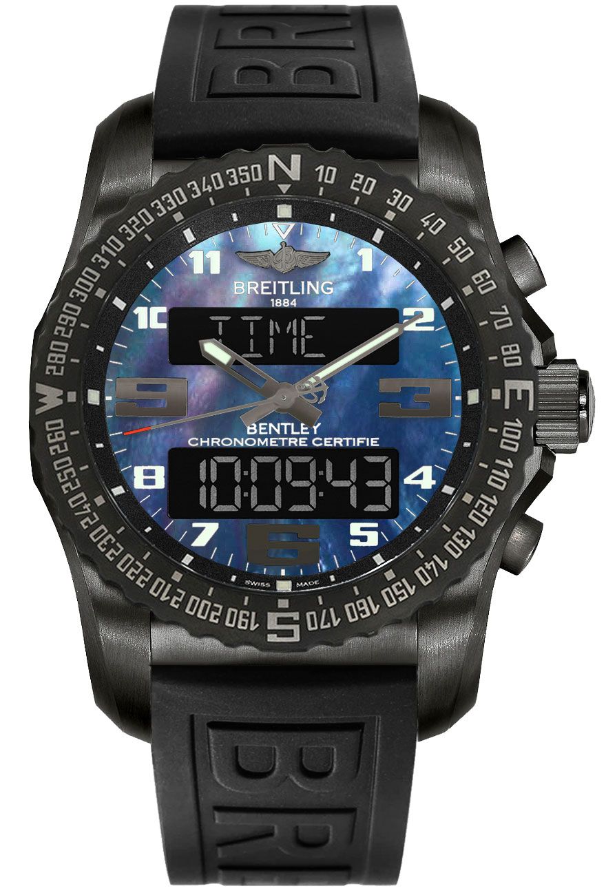 Breitling Bentley Bentayga Cockpit B50 Men's Watch VB50109U/BE29-155S. This sporty 46mm watch features a lightweight black titanium case and is fitted with a Bentley black rubber strap. The blue Mother of Pearl dial has a dual analog and digital display with several useful functions including a perpetual day and date calendar, chronograph, daily alarms, countdown timer and more. It is powered by the Breitling Caliber B50 rechargeable battery operated SuperQuartz movement.