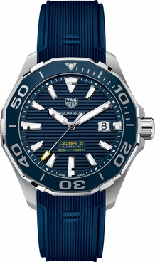 TAG Heuer Aquaracer Calibre 5 WAY201B.FT6150 men's watch. Features a brushed with polished stainless steel case and a blue ceramic unidirectional rotating bezel with 60 minute scale. Comes on a blue rubber strap. The blue opalin dial features luminescent hands and hour markers with white Superluminova. A 60 second / minute scale is located on the blue dial flange. The date is displayed under a magnifying lens at 3 o'clock. Powered by the TAG Heuer Caliber 5 self-winding automatic movement which boasts a 38 hour power reserve, beats at 28,800 vph and contains 25-26 jewels depending on the execution. A flat scratch resistant sapphire crystal with anti-reflective treatment protects the dial. The case is round and 43 mm in diameter. Alternate finishing steel folding clasp with double safety push-buttons. Screw down crown. Alternate finishing steel screw down case back. Water-Resistant to 300 meters / 1000 feet. Functions: hours, minutes, seconds, date. Diving watch style. Swiss Made.